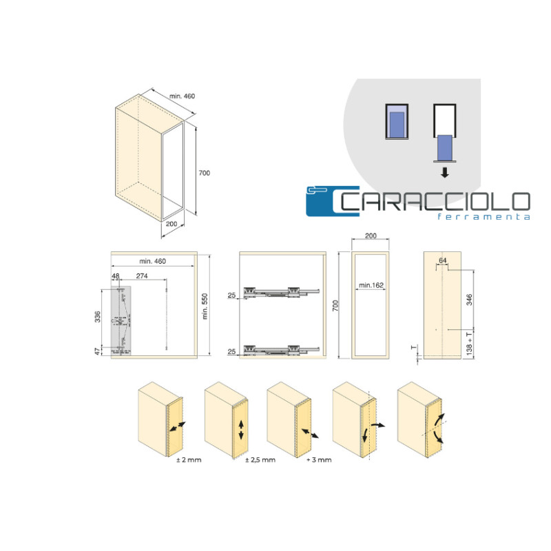 Adatto per moduli larghi 200 mm, alti 700 mm e con profondità minima di 460 mm.